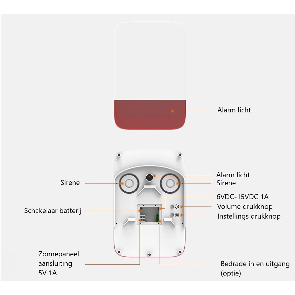 - Optioneel oplaadpaneel voor zonne-energie = Deze functie zorgt voor een handige en milieuvriendelijke manier om uw systeem van stroom te houden,waardoor de noodzaak voor frequente vervanging van de batterij wordt verminderd.