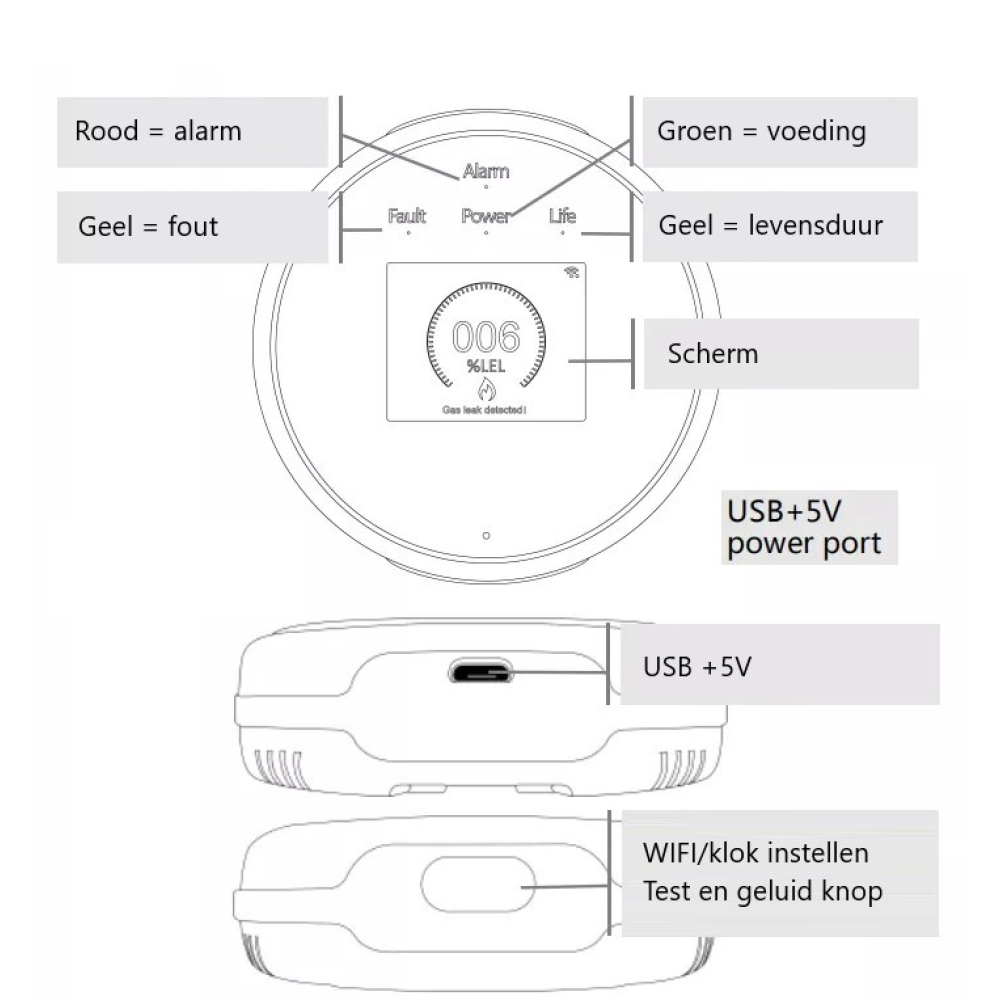 - Detecteert alle soorten ontvlambare gassen zoals LPG en LNG (aardgas).